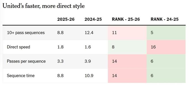 上赛季(2024-25赛季)联赛中进攻速度第五慢的曼联,如今是第八快的。曼联每次控球的传球次数以及包含10次或以上传球的控球序列数量已显著下降。